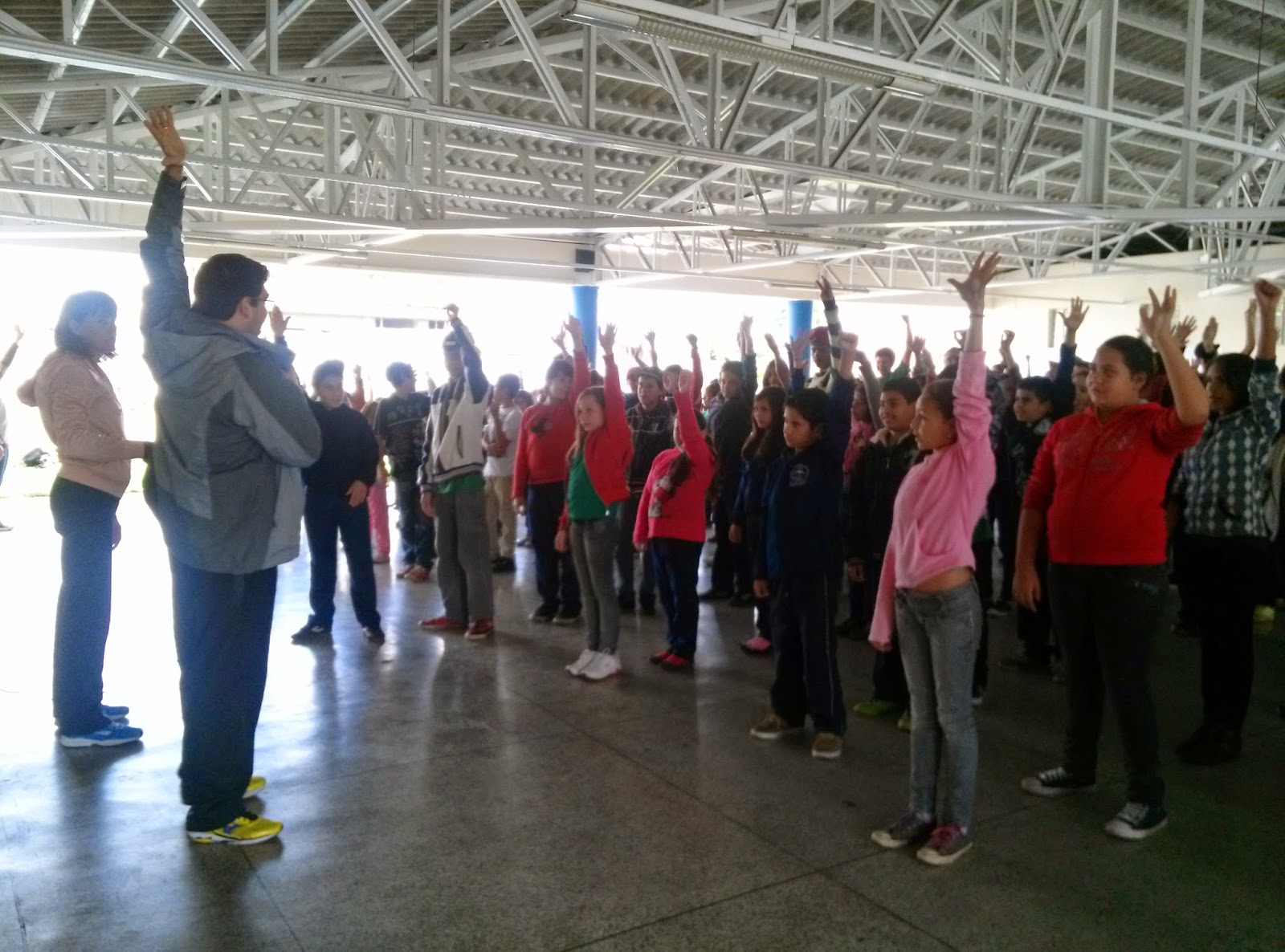 Primeiramente, houve uma explicação a respeito do Dia do Desafio. Depois, foi realizado um alongamento e, em seguida, uma dança folclórica "Sete saltos".